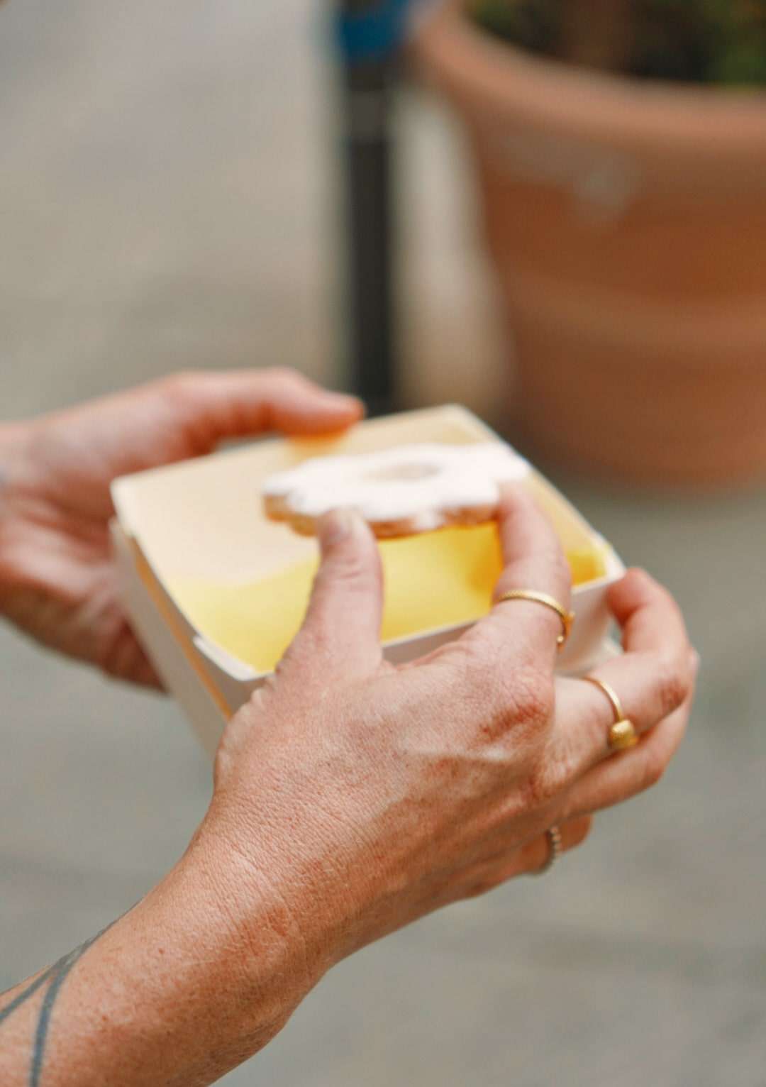 Biscuits, food markers, powered sugar, paper packaging.