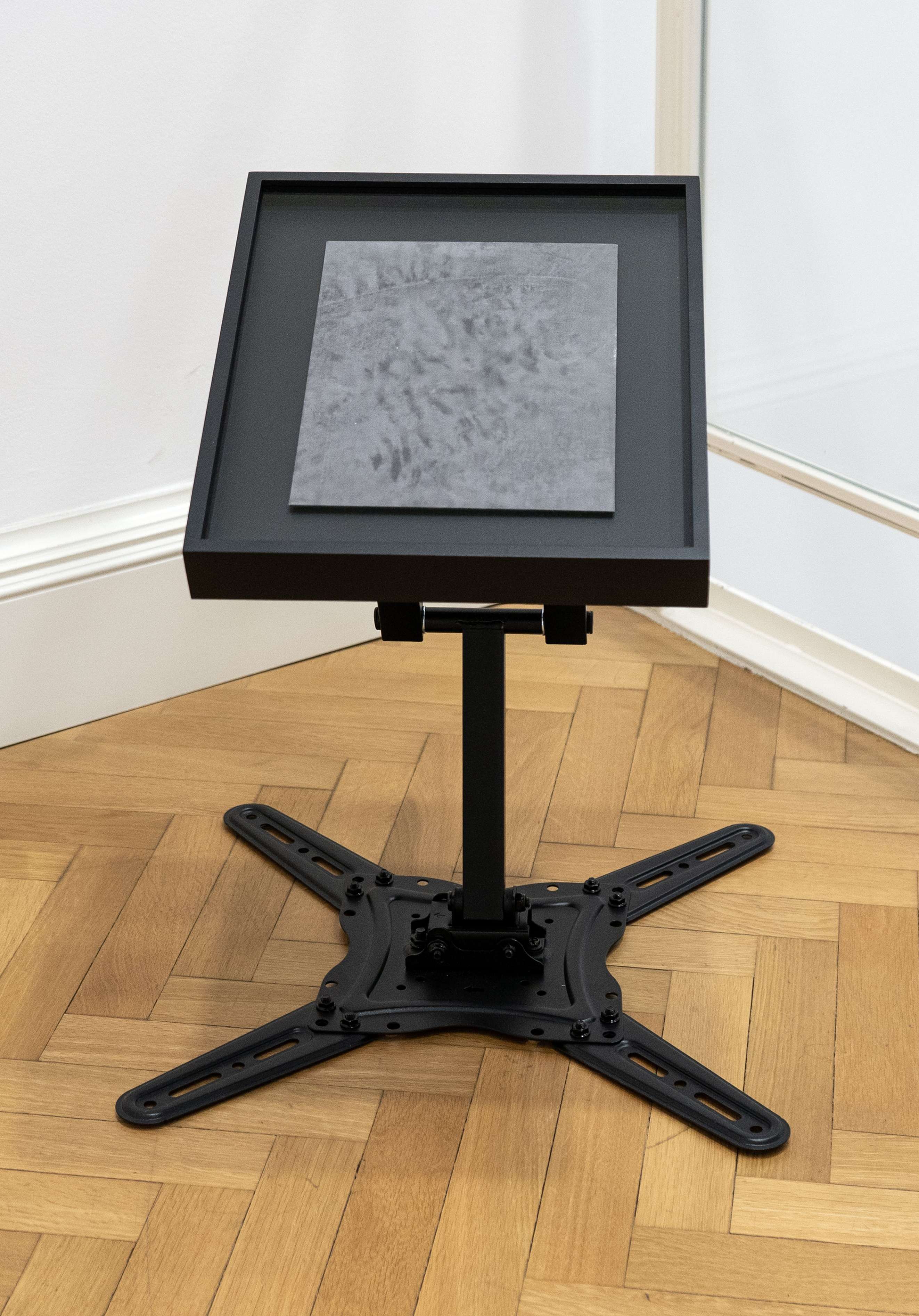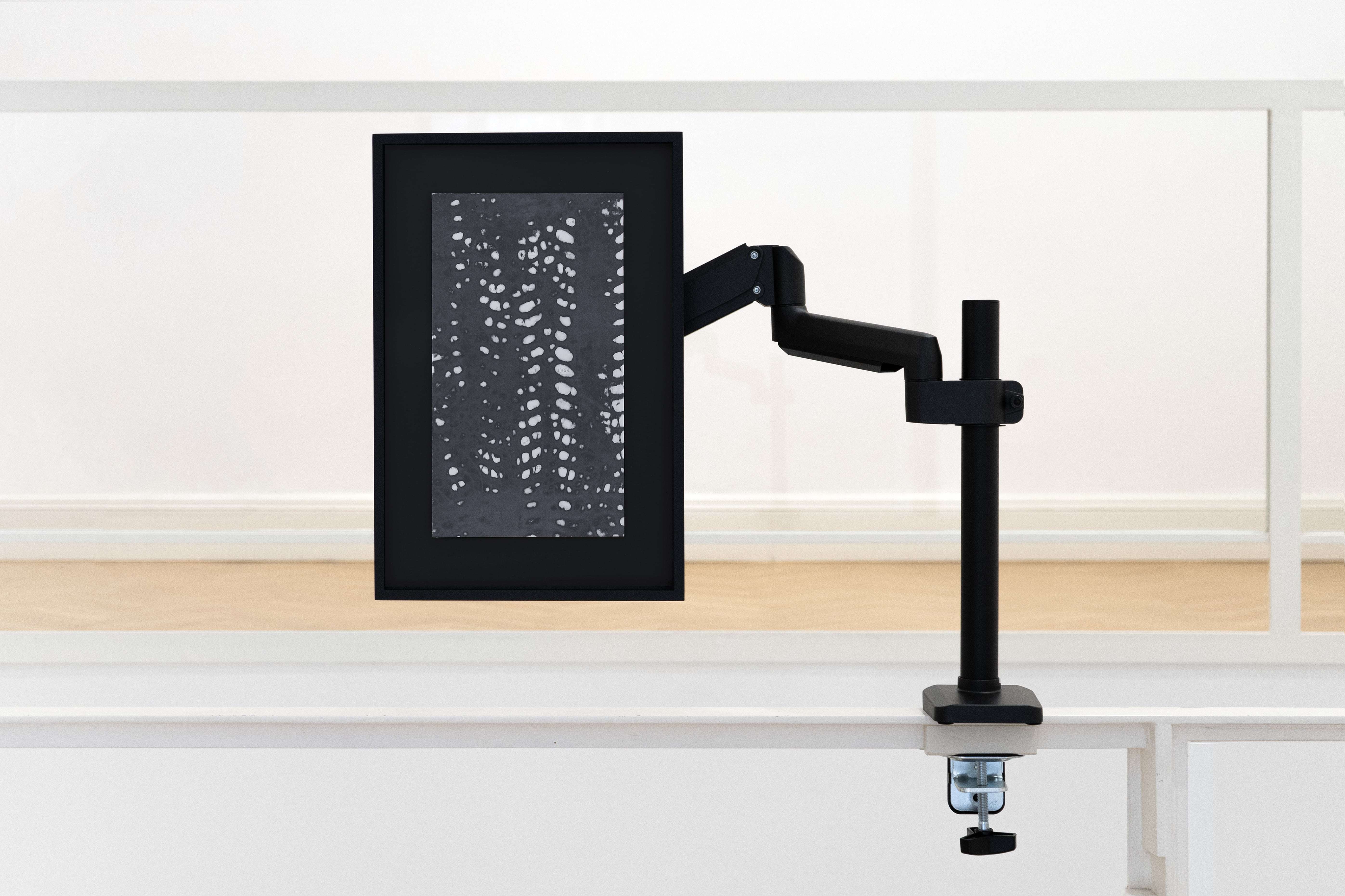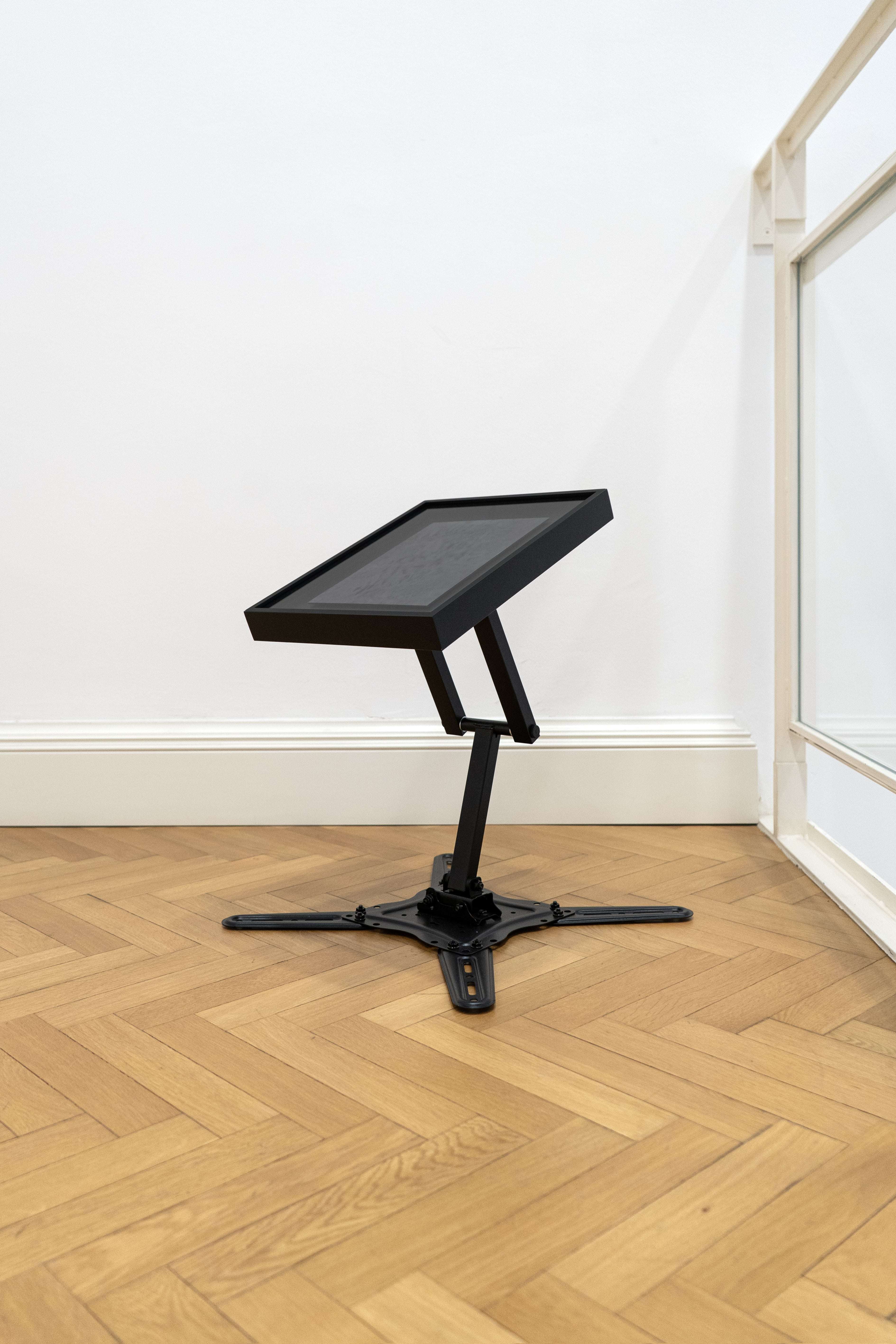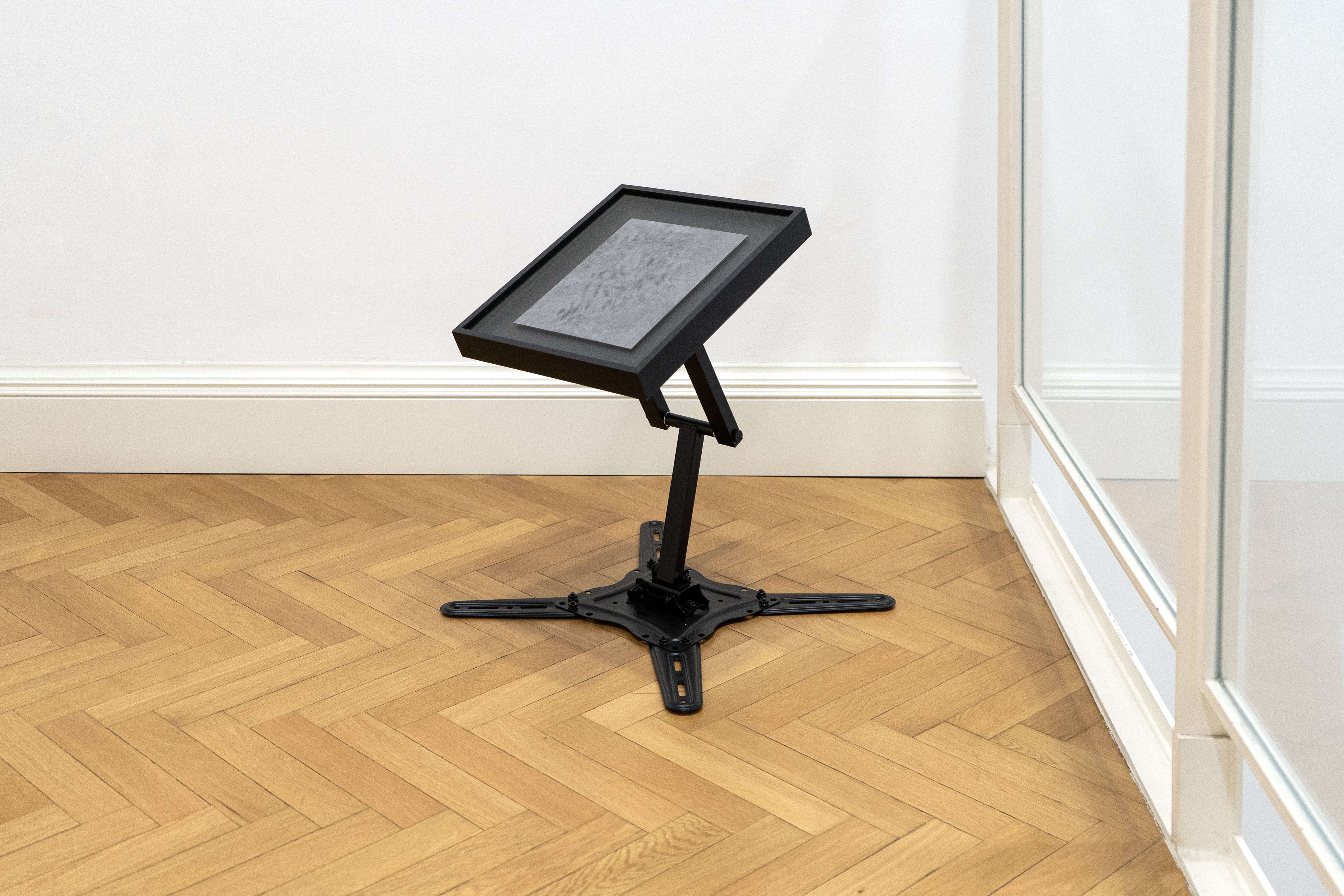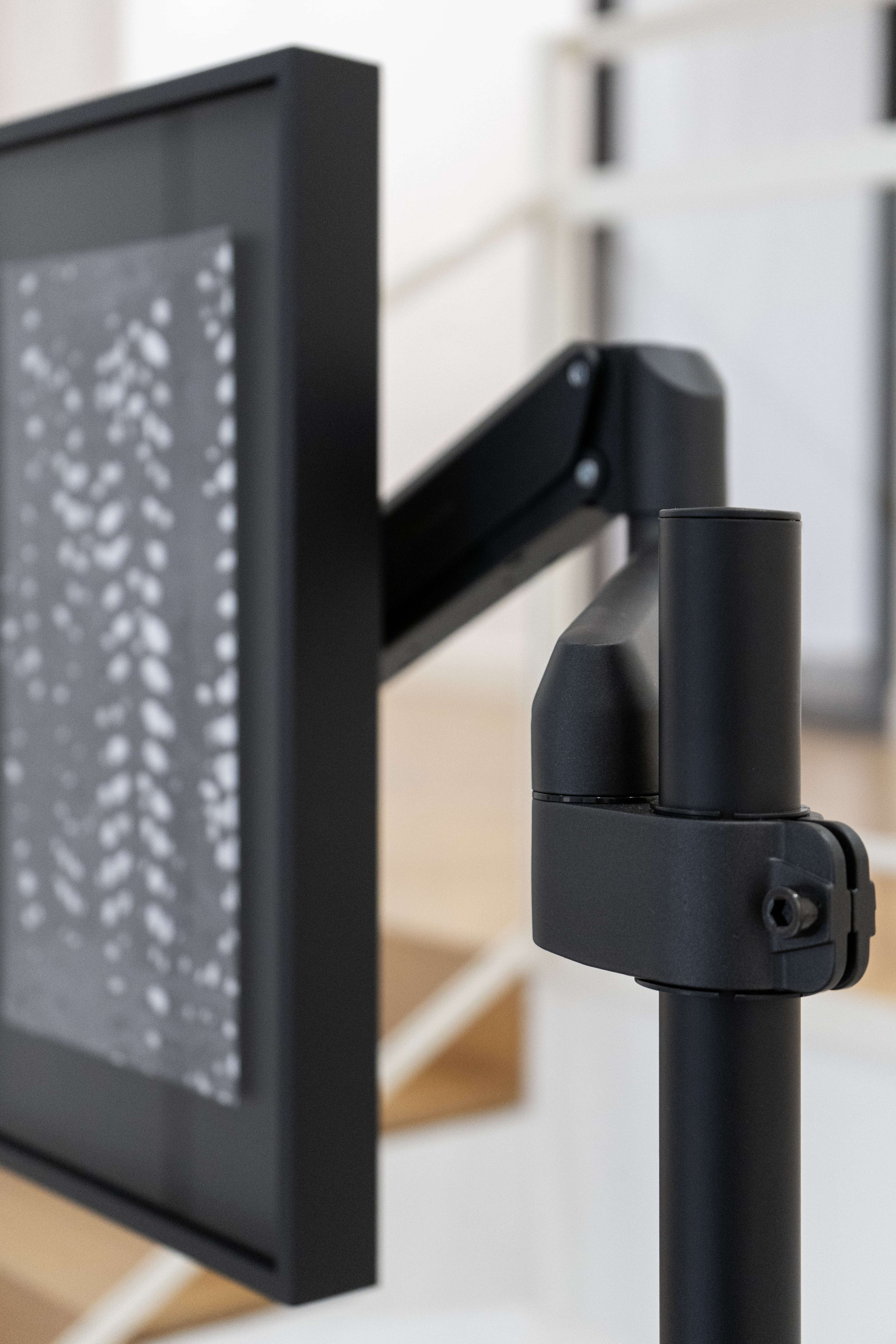 Time thus becomes the subject of the work: it takes three to ten years for the blackening to dissolve and the image to slowly re-emerge. The effectiveness of the machine, which can produce results in a fraction of a second, is negated and replaced by an extended process. This gives humans the opportunity to anticipate, understand or resolve the initial request independently. The blackened surface recalls a blank display screen, finding a parallel in Kazimir Malevich's Black Square: a visual negation and a reset encompassing latent expressive potential. The supports holding the works are composed of monitor arms and bases, allowing the prints to be oriented in space and promoting a dynamic relationship with the viewer's gaze. The titles of each print correspond to the questions or commands addressed to the AI, offering a glimpse of what is to be revealed.