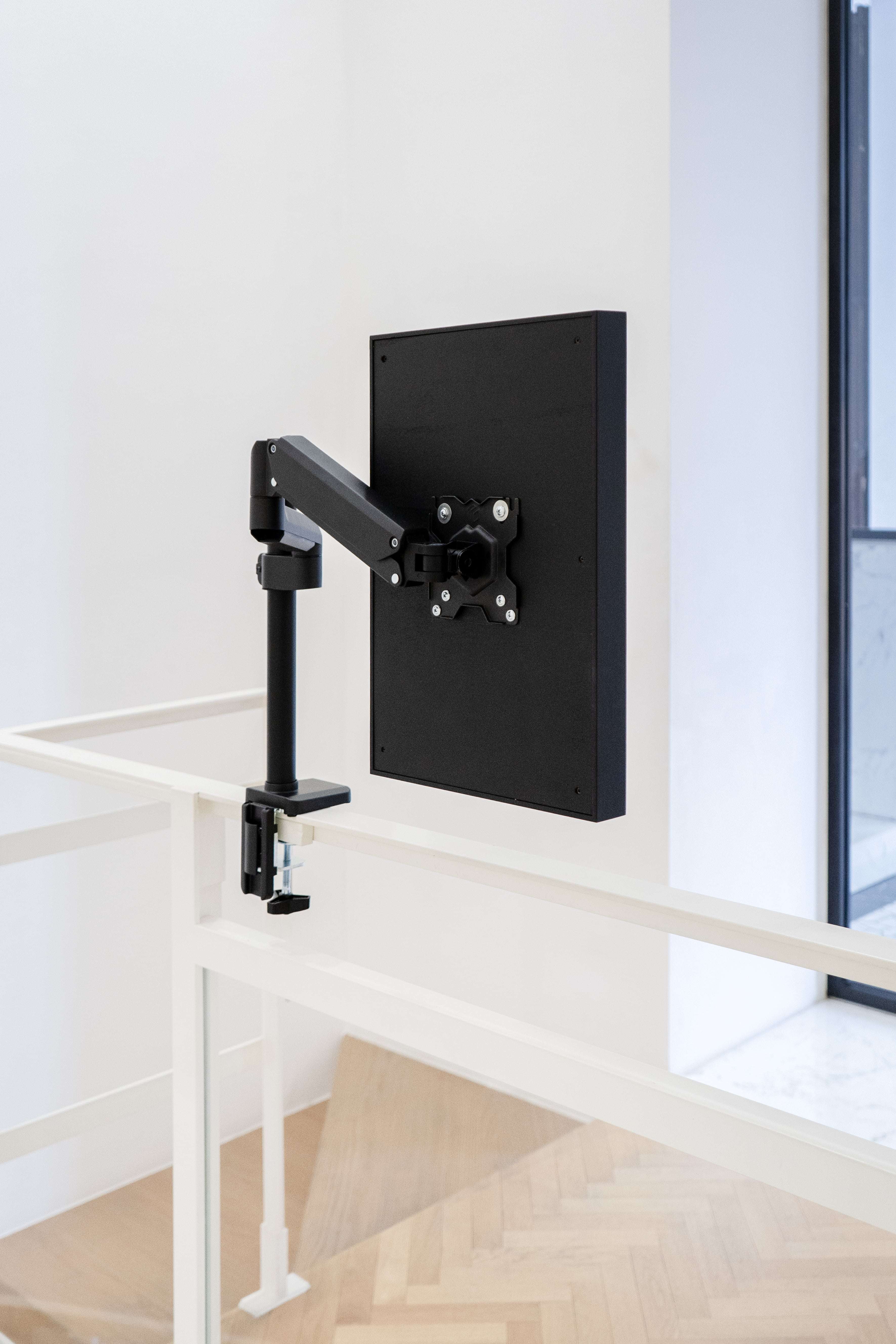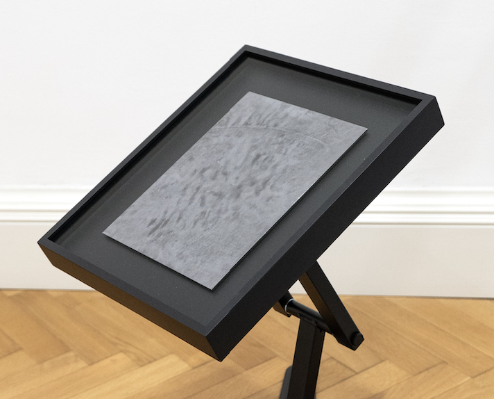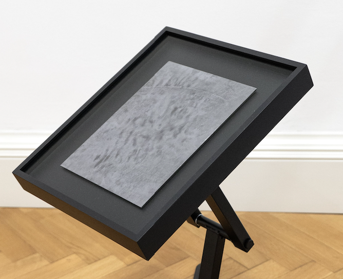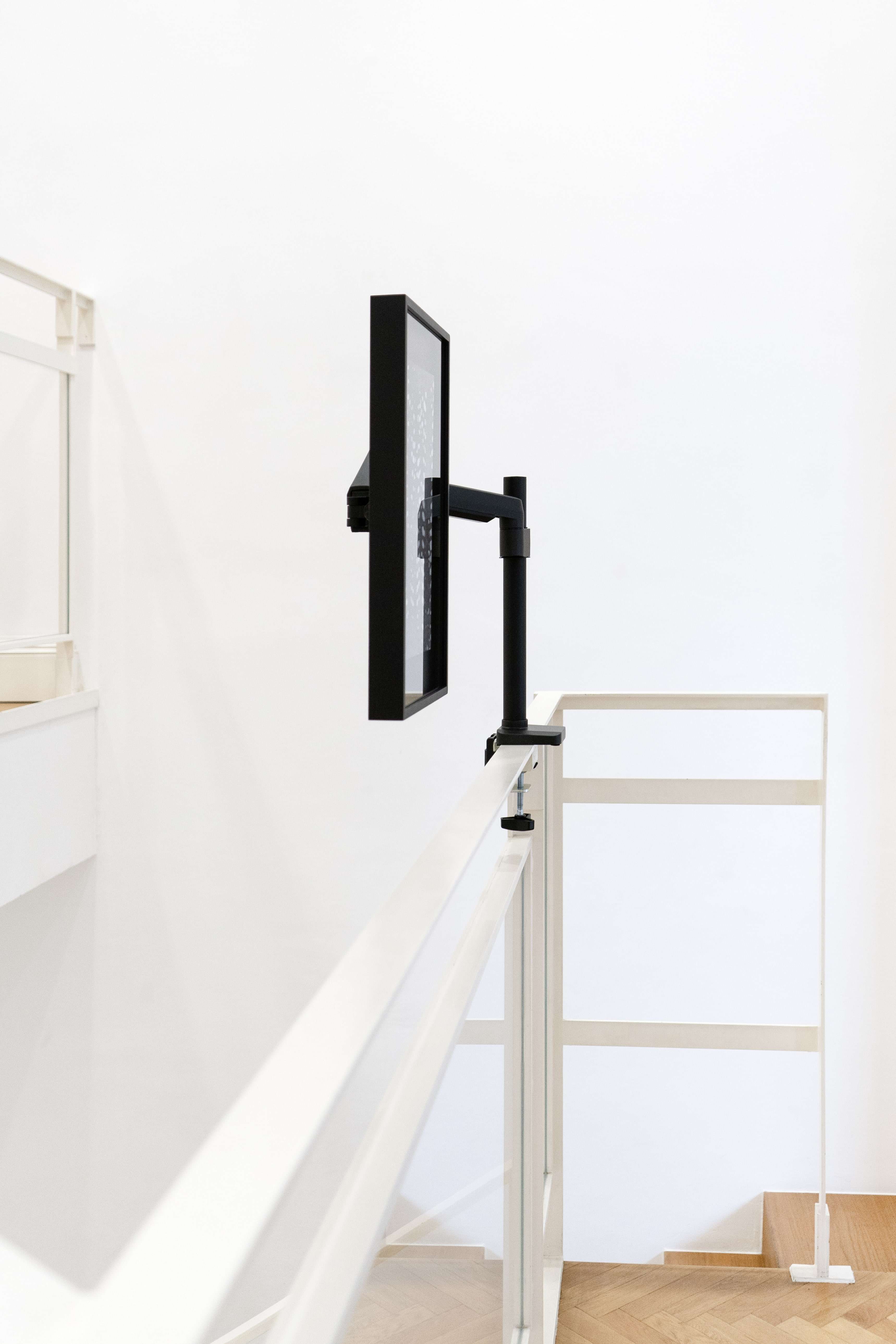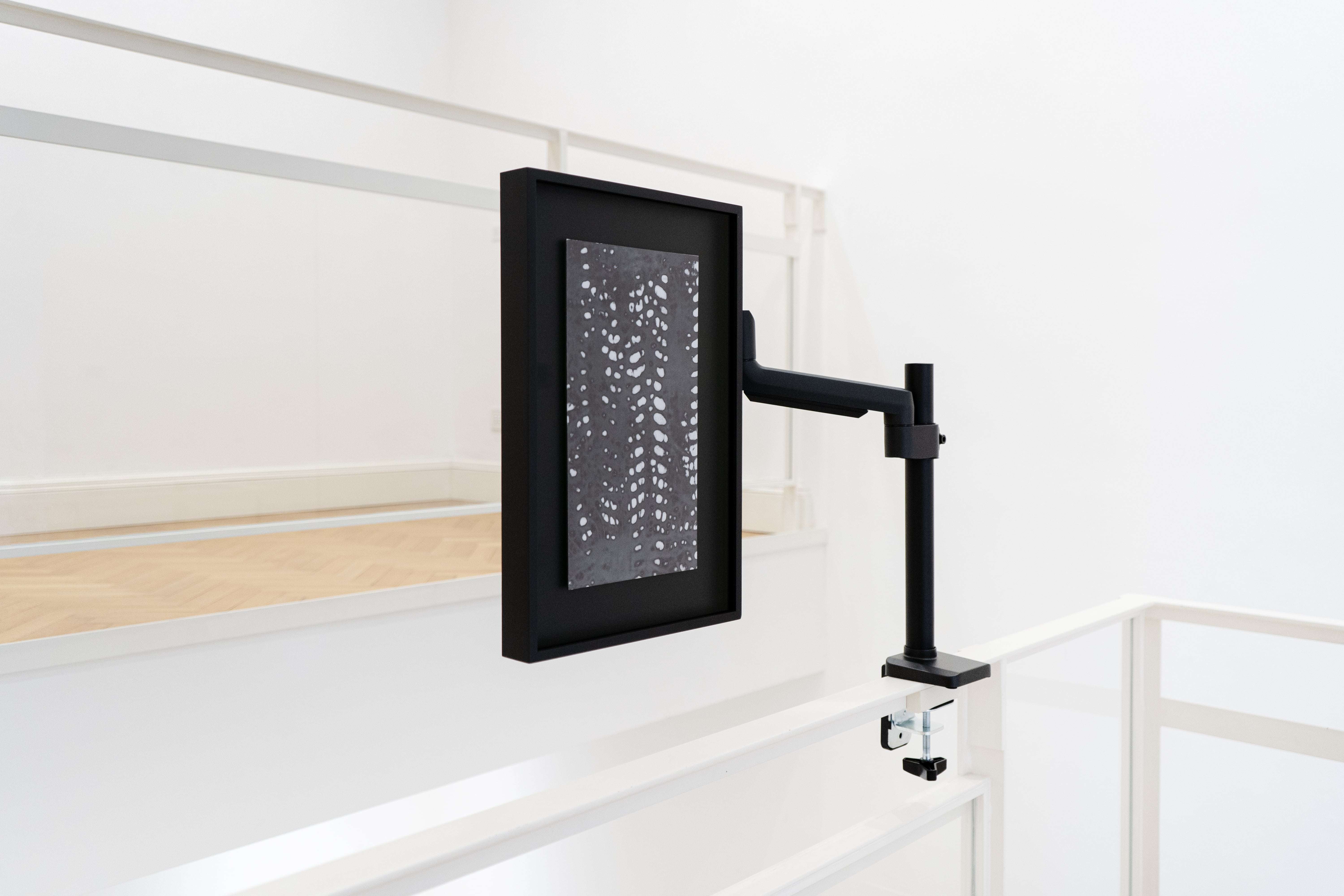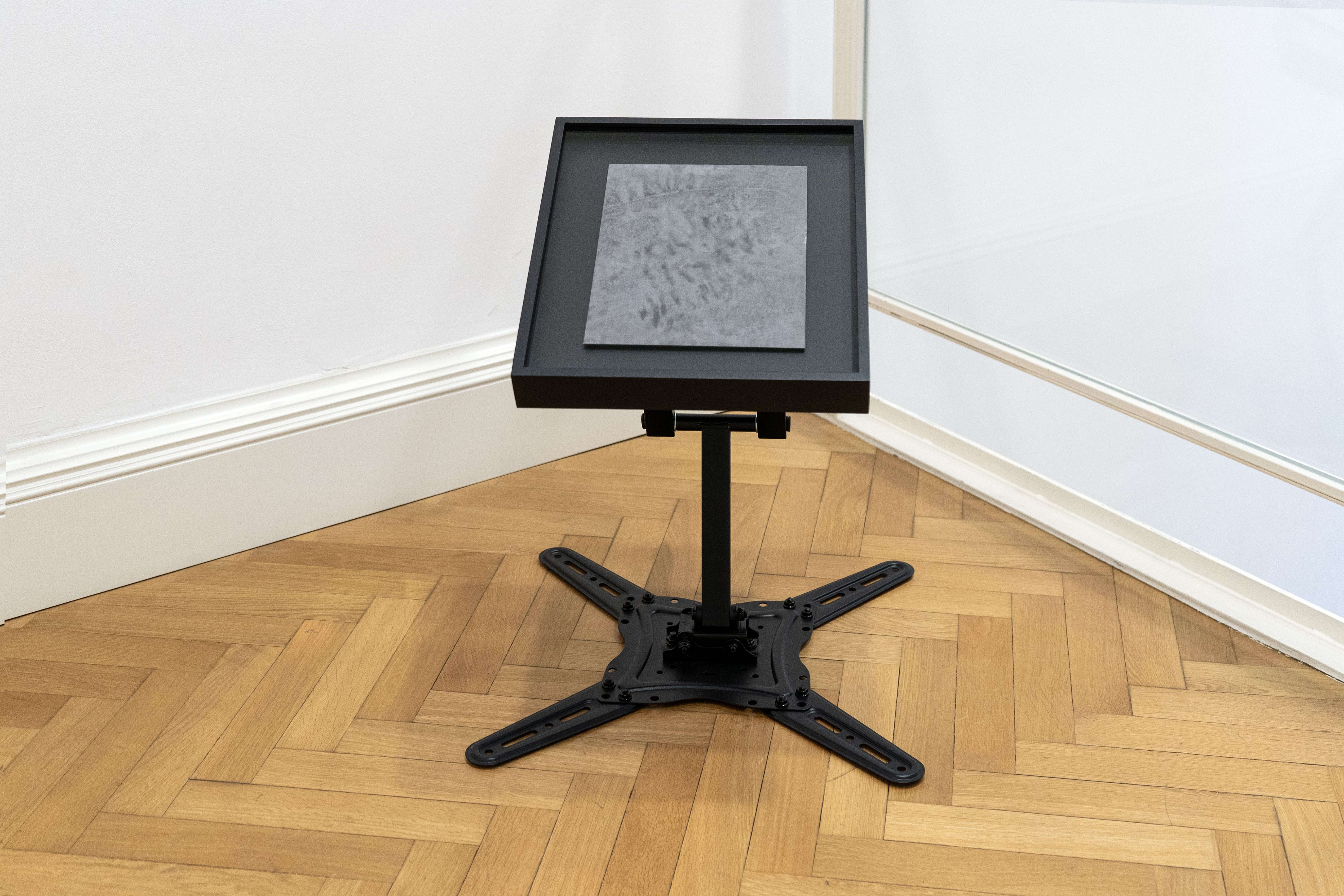 Time thus becomes the subject of the work: it takes three to ten years for the blackening to dissolve and the image to slowly re-emerge. The effectiveness of the machine, which can produce results in a fraction of a second, is negated and replaced by an extended process. This gives humans the opportunity to anticipate, understand or resolve the initial request independently. The blackened surface recalls a blank display screen, finding a parallel in Kazimir Malevich's Black Square: a visual negation and a reset encompassing latent expressive potential. The supports holding the works are composed of monitor arms and bases, allowing the prints to be oriented in space and promoting a dynamic relationship with the viewer's gaze. The titles of each print correspond to the questions or commands addressed to the AI, offering a glimpse of what is to be revealed.
