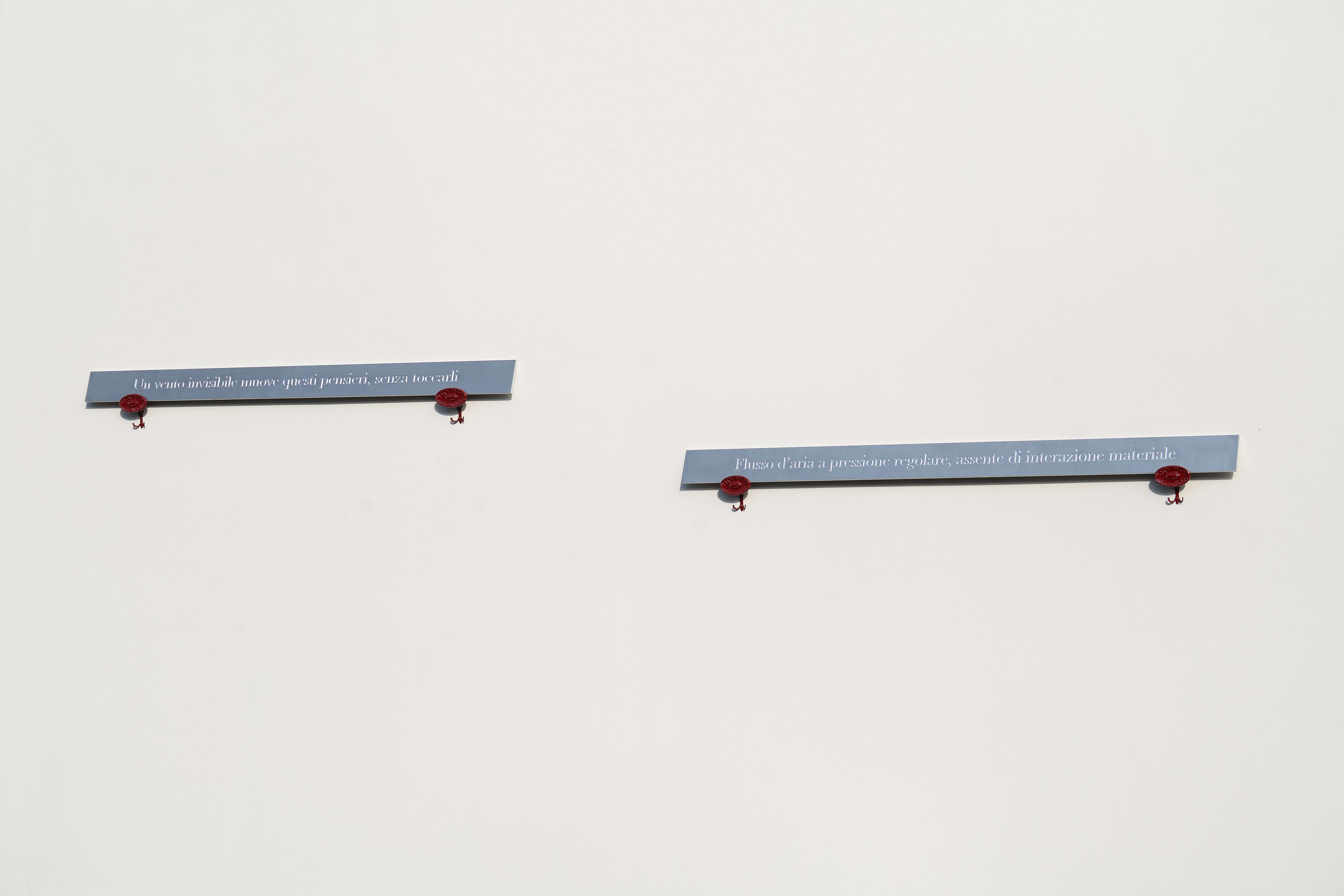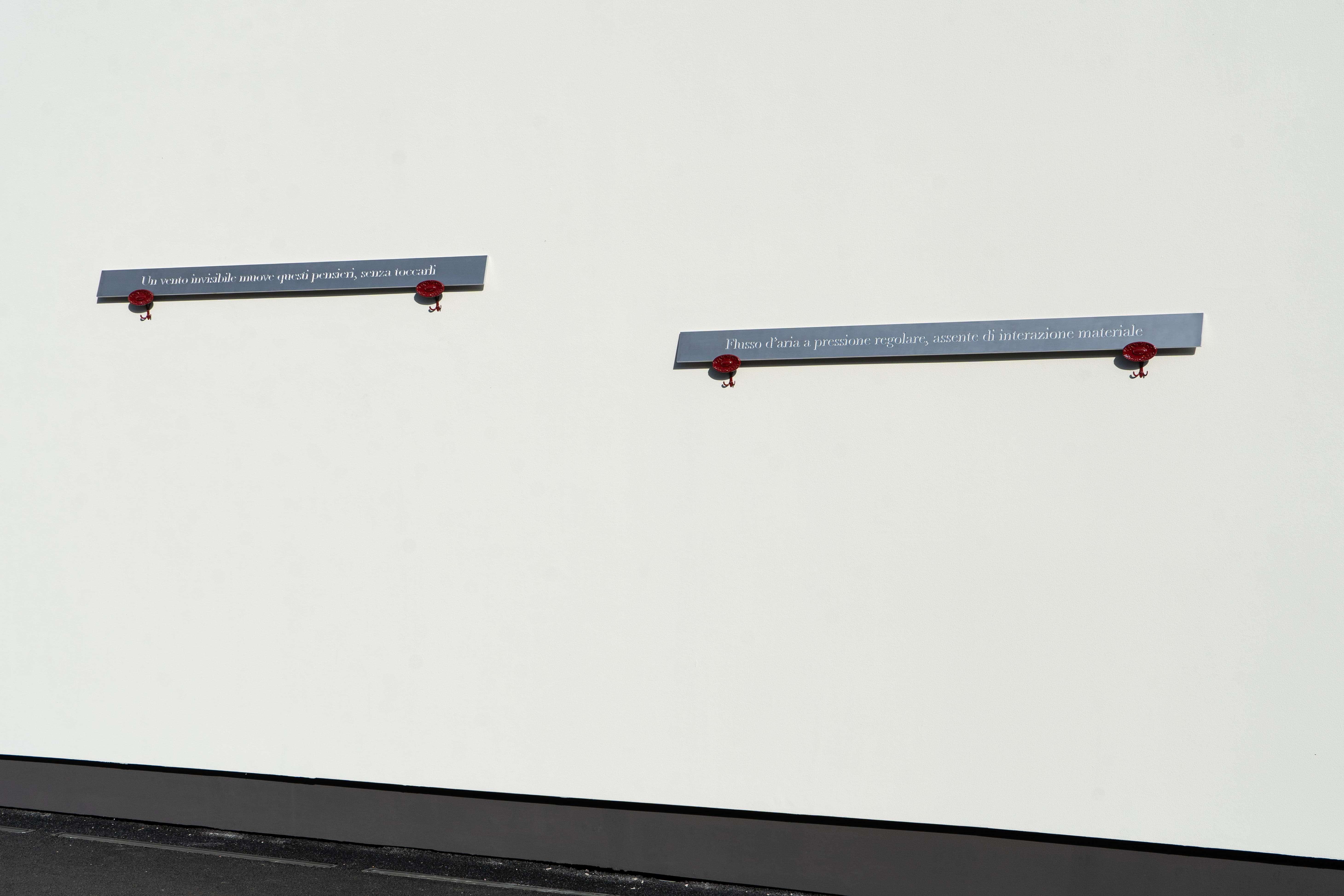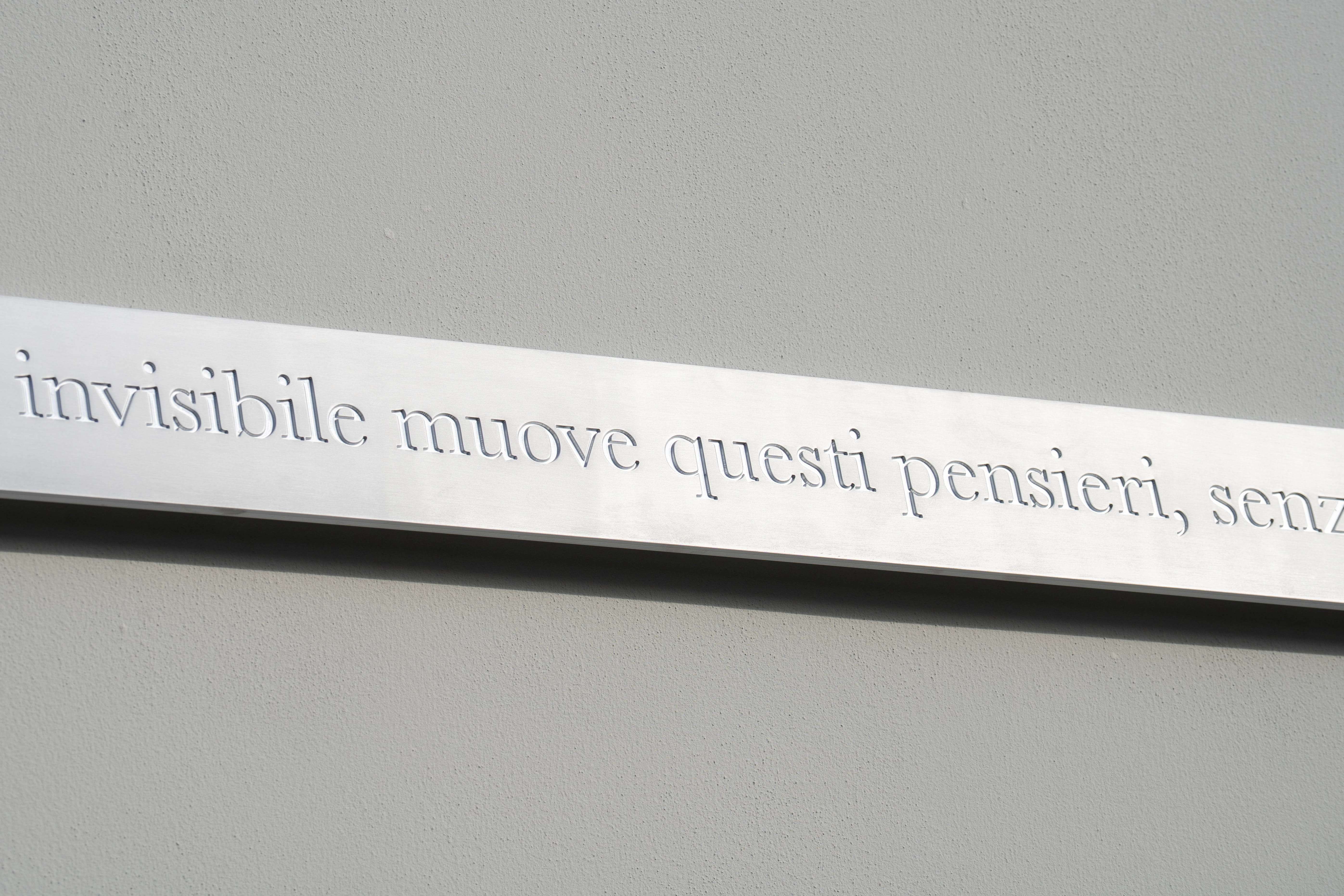 The sentences are chosen in relation to the context in which the work is exhibited and, when juxtaposed, generate a continuous reading that takes the form of a material poem. In an exhibition setting, the work activates inner images and a slower, more reflective dimension of observation; in infrastructural contexts, such as an airport, the language relates to the experience of travel, transit, and the control systems that regulate the flow and presence of bodies in space.