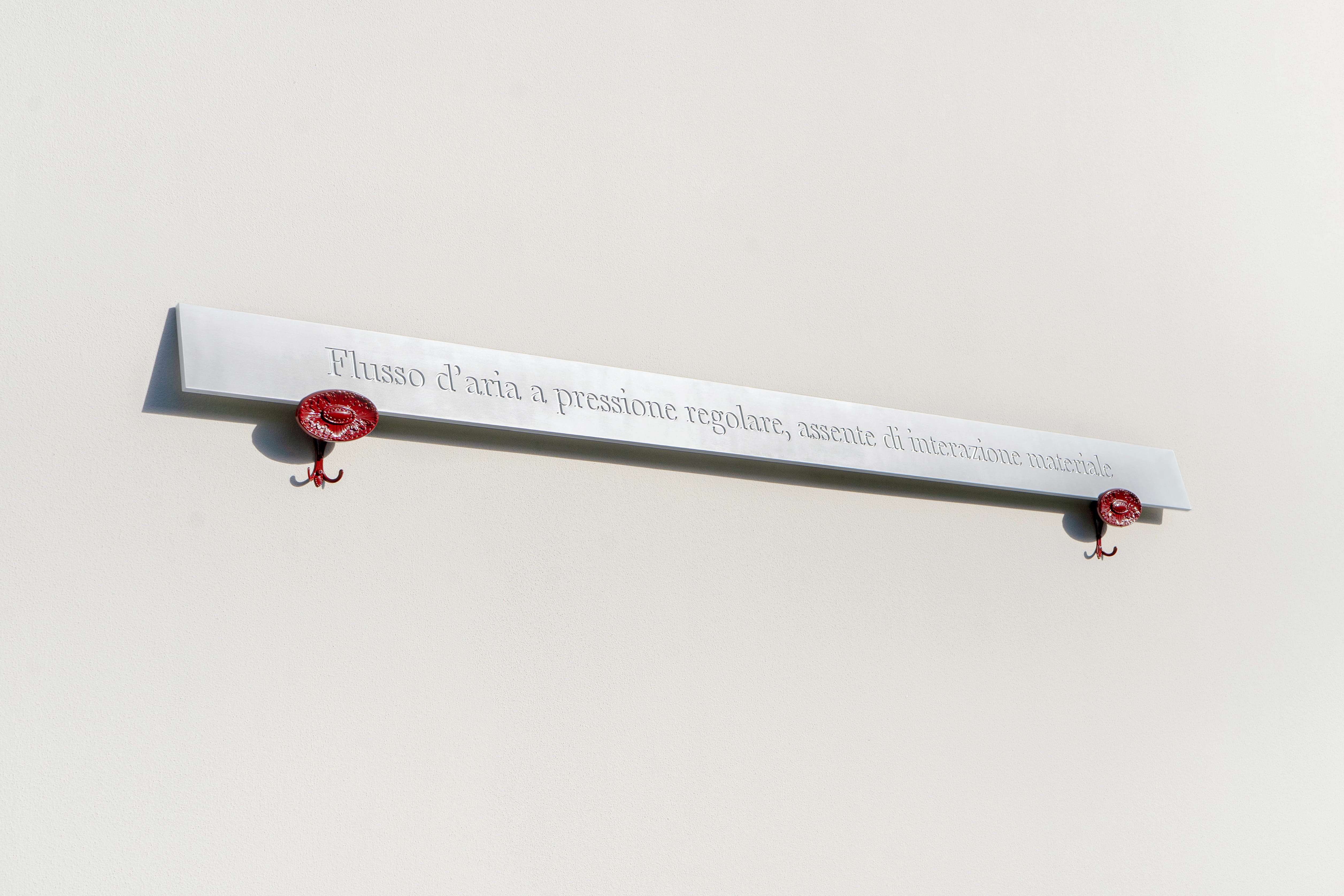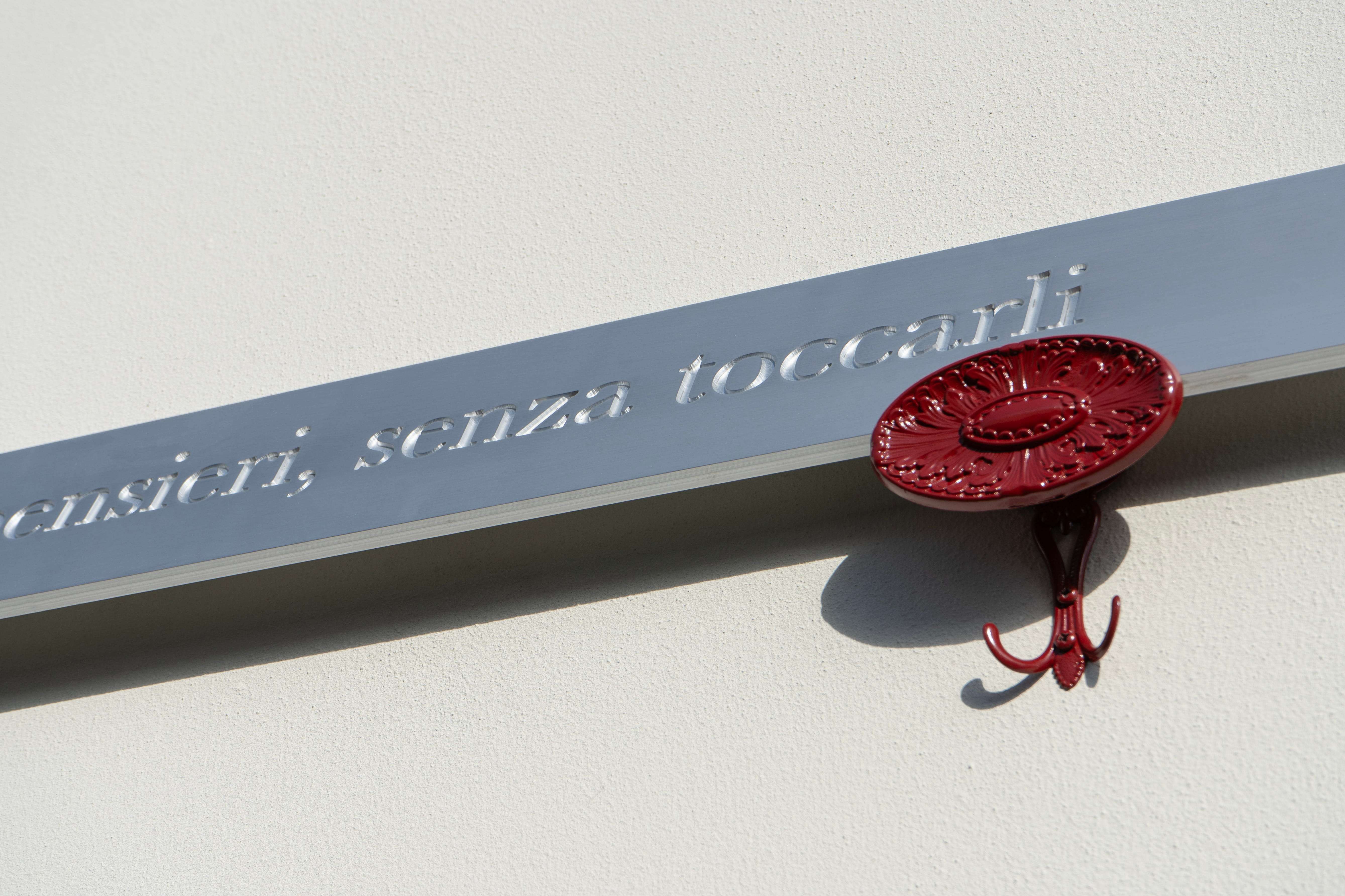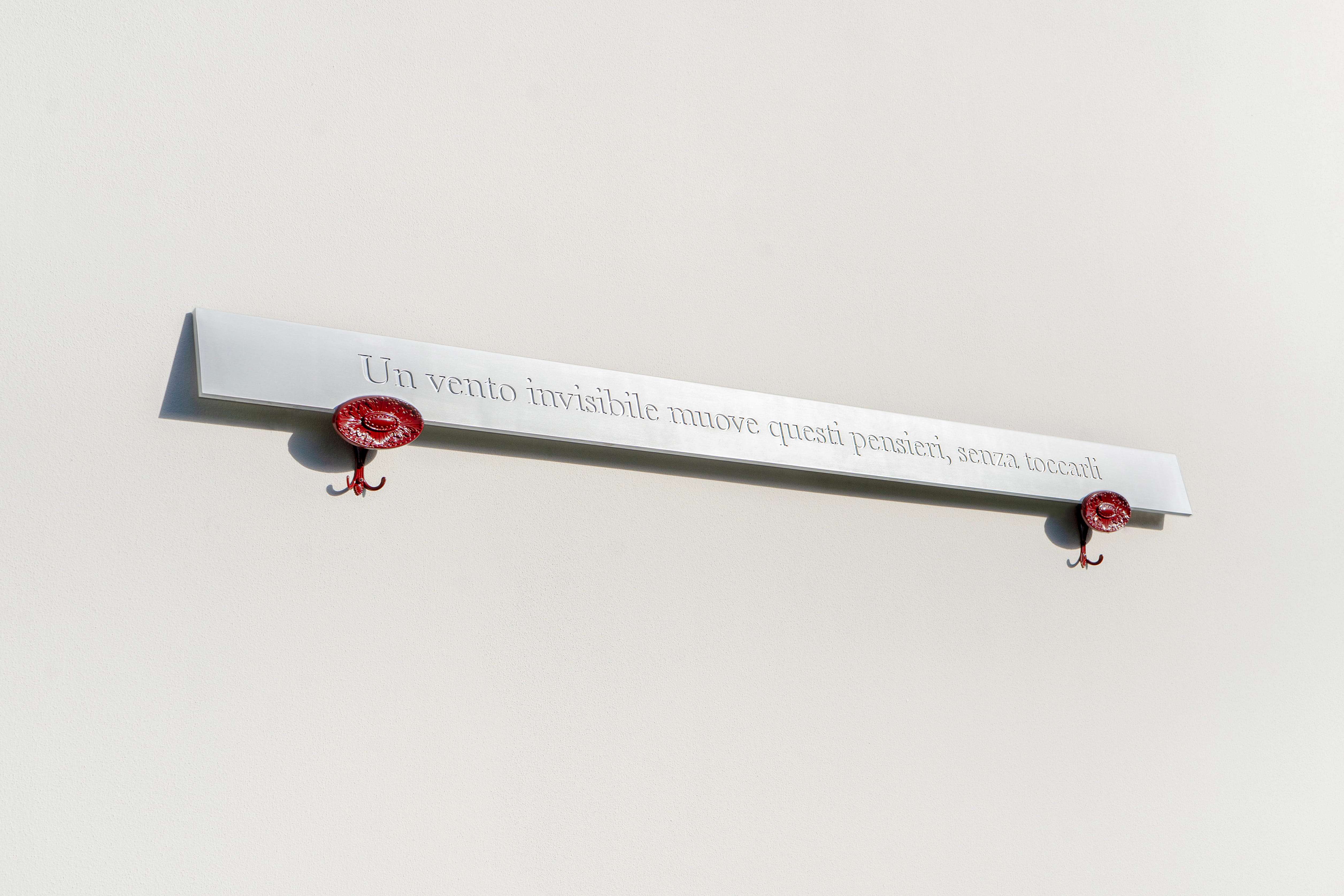 The materials also participate in this comparison. The engraved aluminum, cold and industrial, recalls functional surfaces and technical recording processes, while the vintage ornamental hooks introduce a warm and familiar element. This tension between cold and warm, calculation and imagination, reinforces the dialogue between the two languages and makes their coexistence visible.